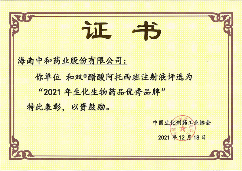 2021年12月18日,在北京召開的“中國生化制藥工業(yè)協(xié)會(huì)第八屆會(huì)員大會(huì)暨2021年協(xié)會(huì)年會(huì)”上,海南中和藥業(yè)產(chǎn)品和雙?醋酸阿托西班注射液榮獲“2021年生化生物藥品優(yōu)秀品牌”稱號。