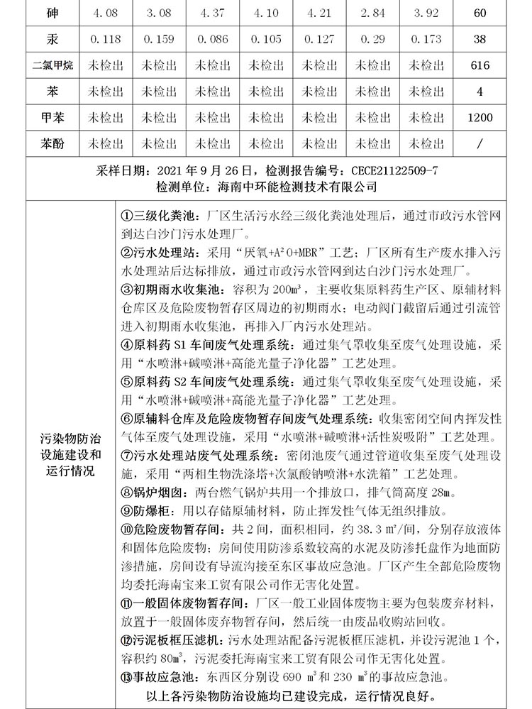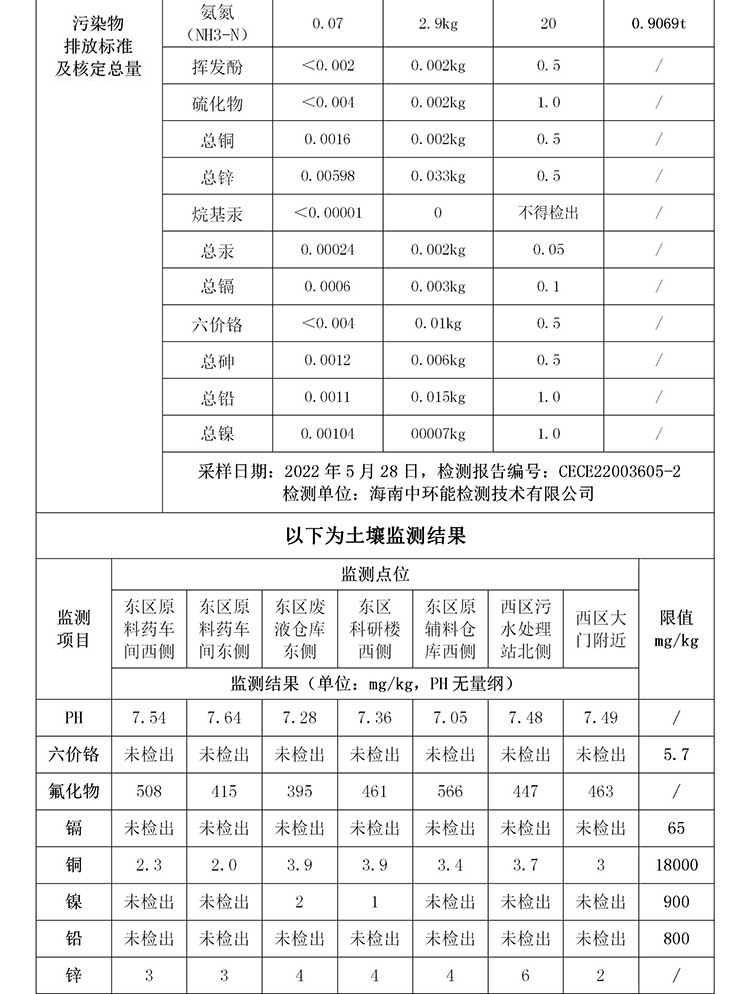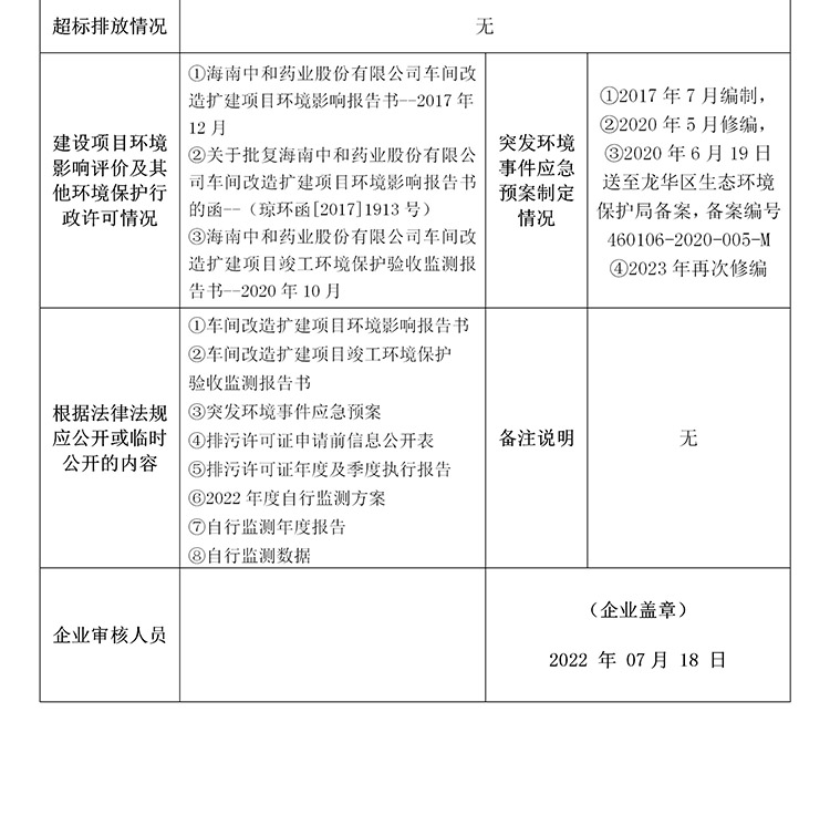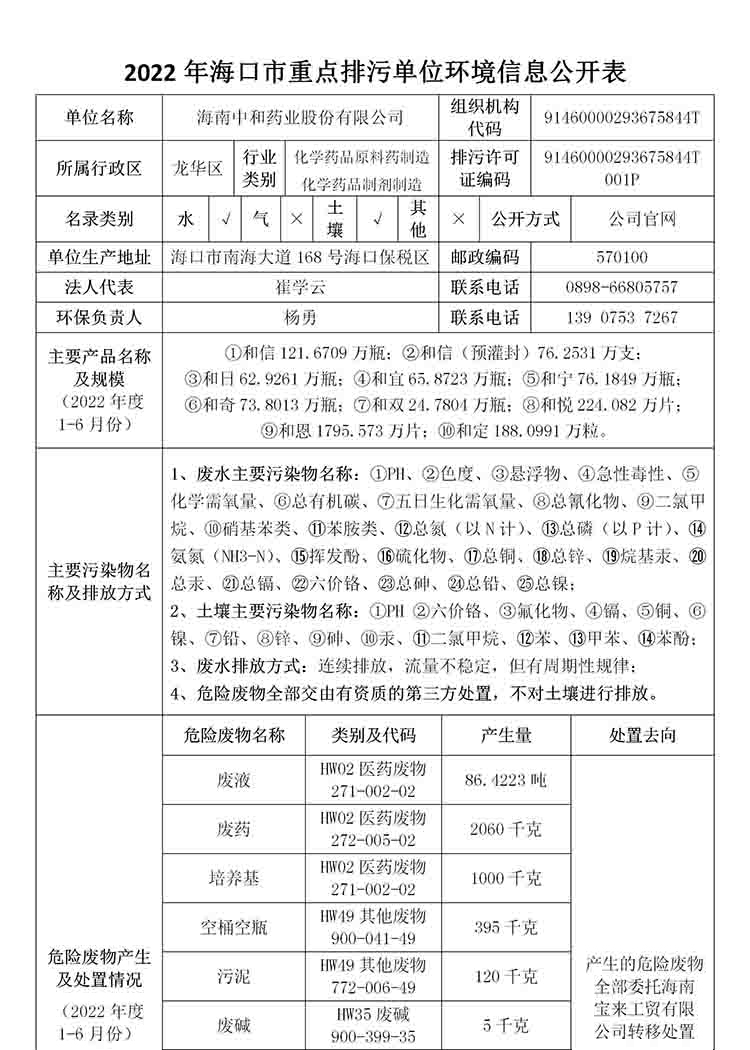 海南中和藥業(yè)股份有限公司2022年??谑兄攸c排污單位環(huán)境信息公開表
