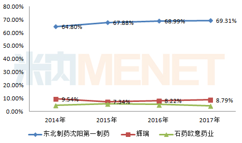 從2017年的數(shù)據(jù)看,東北制藥以69.31%的市場份額位居首位,原研廠家輝瑞以8.79%的比例緊接其后。從近幾年各大品牌的市場份額變化看,東北制藥基本呈現(xiàn)穩(wěn)定增長的態(tài)勢(shì),輝瑞的市場份額則有所波動(dòng)。