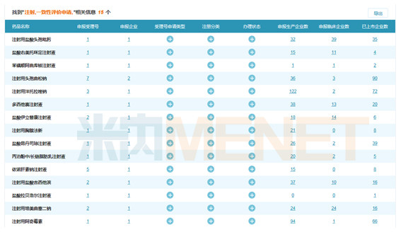 據(jù)米內(nèi)網(wǎng)MED中國藥品審評(píng)數(shù)據(jù)庫2.0數(shù)據(jù),截至目前,除了已經(jīng)通過一致性評(píng)價(jià)的注射用阿奇霉素,國家藥監(jiān)局還接收到化藥注射劑一致性評(píng)價(jià)申報(bào)29個(gè),涉及14個(gè)品種、10家企業(yè)。