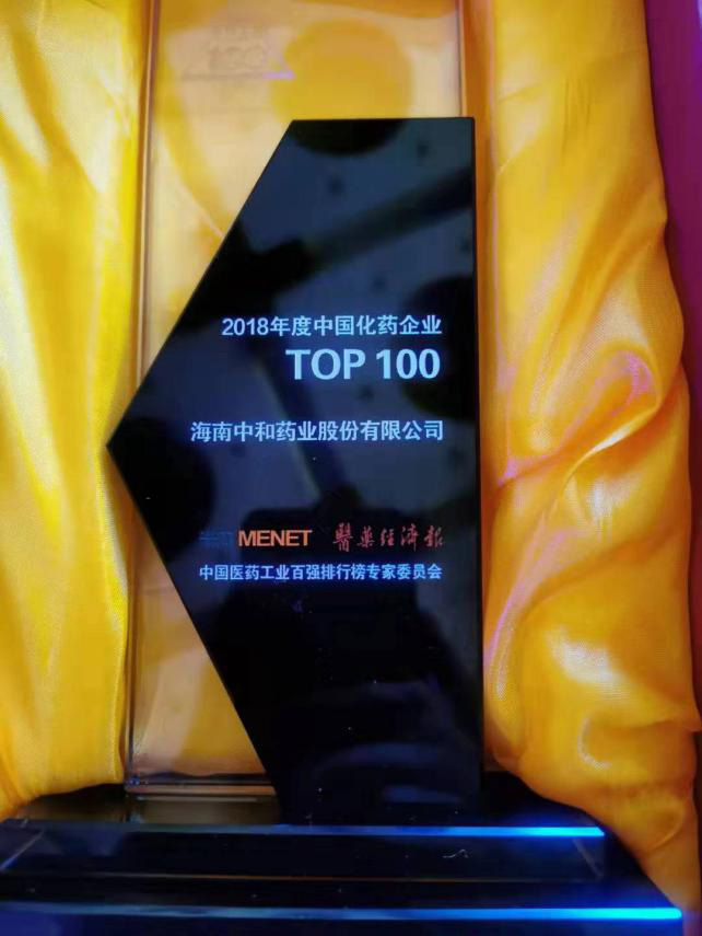 ——熱烈祝賀海南中和藥業(yè)股份有限公司榮獲“2018年度中國(guó)化藥企業(yè)TOP100排行榜”TOP100企業(yè)稱號(hào)