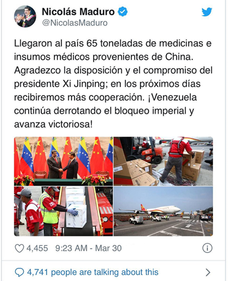 3月30日,中國政府向拉美地區(qū)派出的第一個(gè)醫(yī)療專家組到達(dá)委內(nèi)瑞拉,并帶來了第二批抗疫物資。