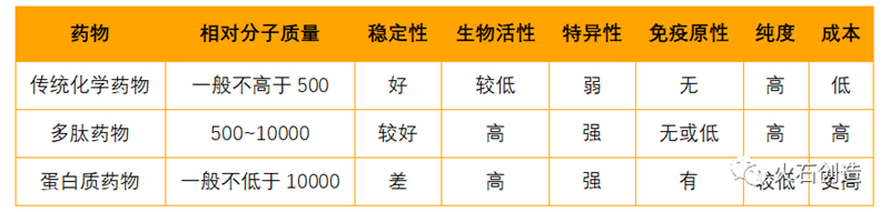 表1 多肽藥物、傳統(tǒng)化學(xué)藥物、蛋白質(zhì)藥物比較
