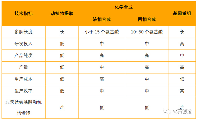 1.從動植物中提取,是先用物理、化學(xué)技術(shù)對動植物組織進行初步處理,然后經(jīng)過酶解或其他消解技術(shù)降解蛋白前體,最后利用溶劑將多肽進行提取。但由于動植物體內(nèi)活性多肽物質(zhì)含量很低,提取純度較低,且存在潛在的生物安全風(fēng)險,限制了在臨床上的應(yīng)用,技術(shù)正逐漸被淘汰。
