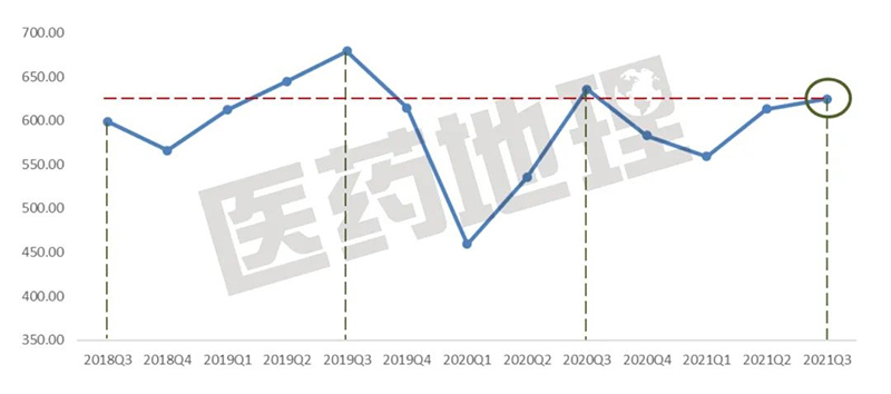 基于PDB國內(nèi)樣本醫(yī)院市場數(shù)據(jù),2021年前三季度共實(shí)現(xiàn)銷售額約1797億元,相較于2020年同期回升10.24%。雖然2020Q1是近三年來的最低點(diǎn),但2021Q3卻成為近兩年的三季度最低點(diǎn),Q2到Q3的環(huán)比提升僅1.86%。如果按照往年的Q4季節(jié)性回落推算,2021年全年市場銷售額仍與2019年有著不小的差距。