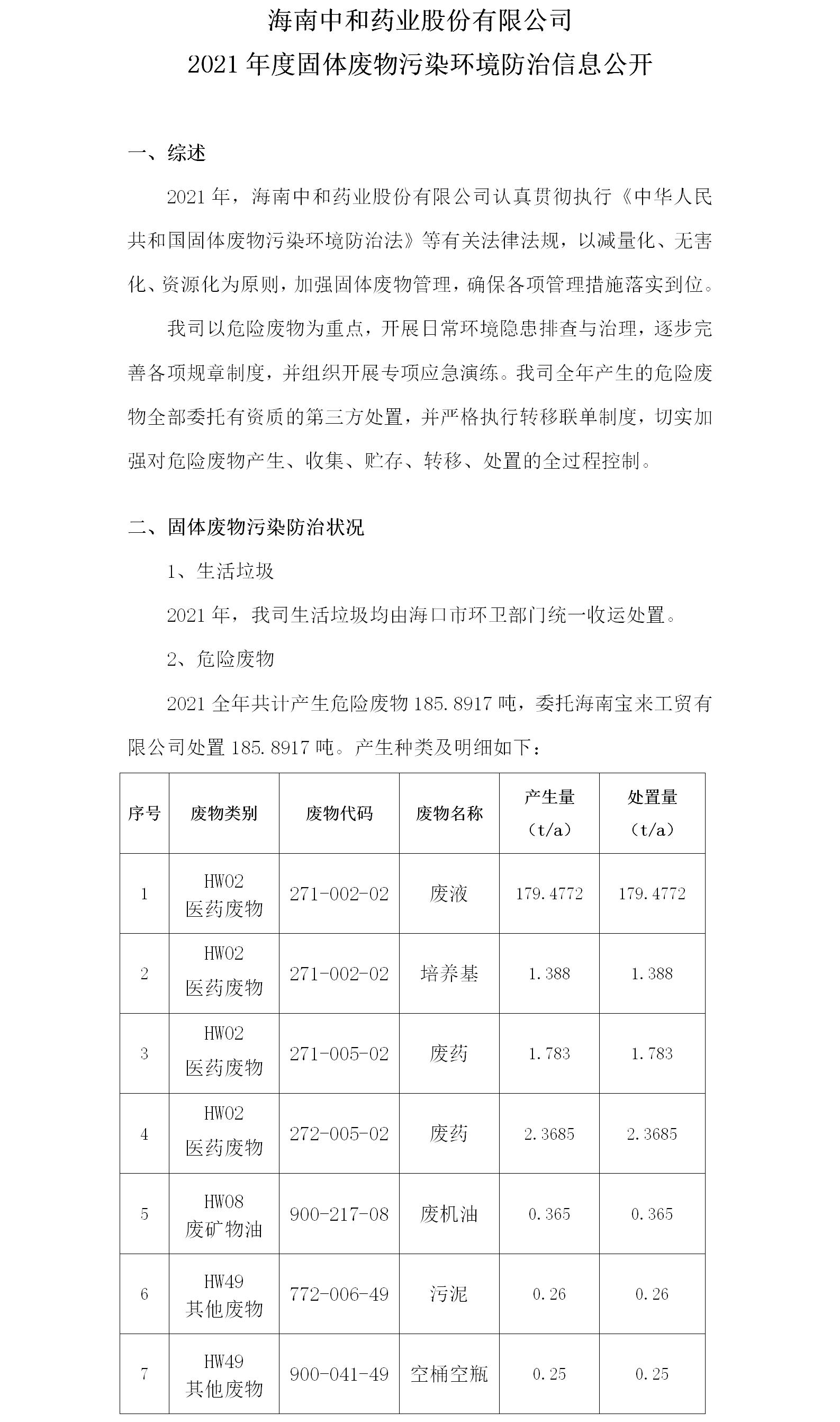 海南中和藥業(yè)股份有限公司2021年度固體廢物污染環(huán)境防治信息公開