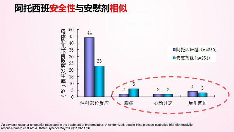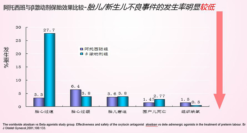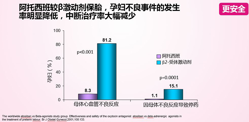 2.阿托西班與β激動劑保胎效果比較,孕婦心血管方面的不良事件的發(fā)生率明顯減少了9倍,中斷治療率大幅減少。