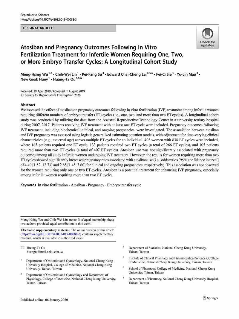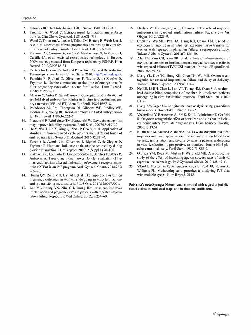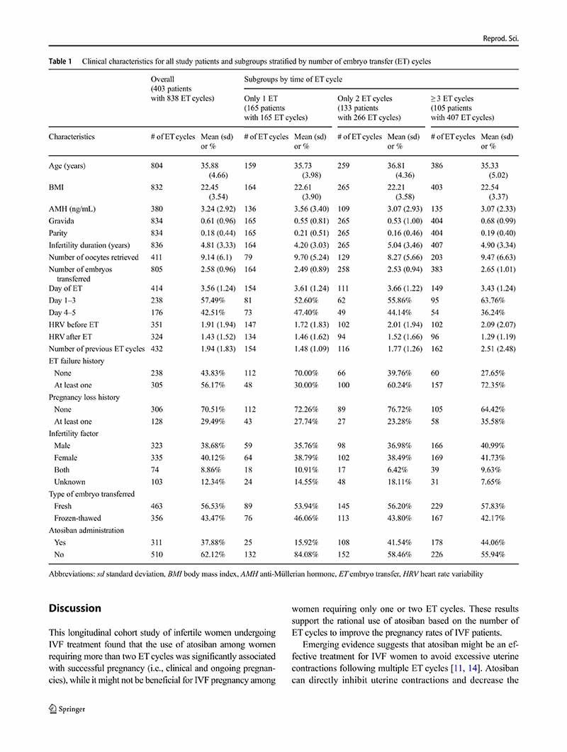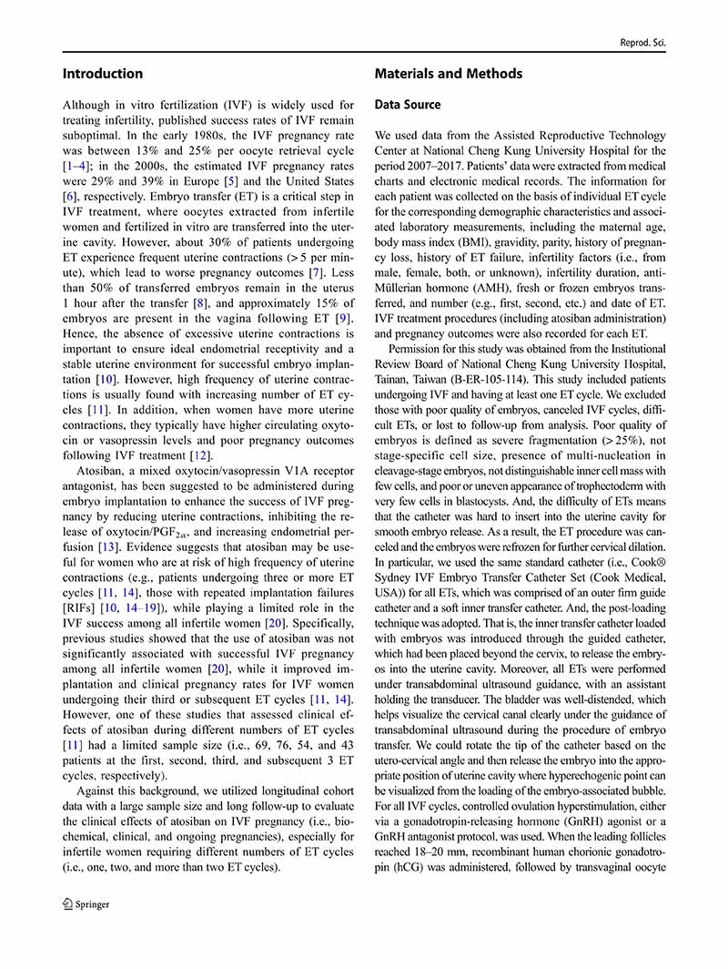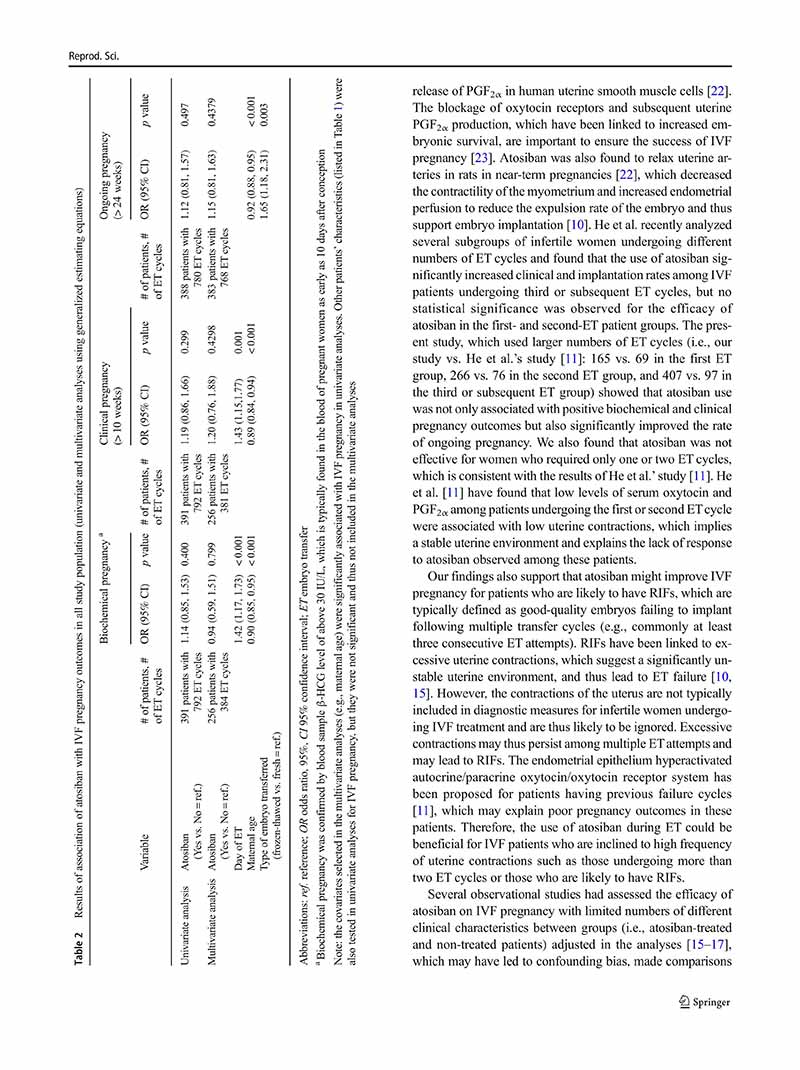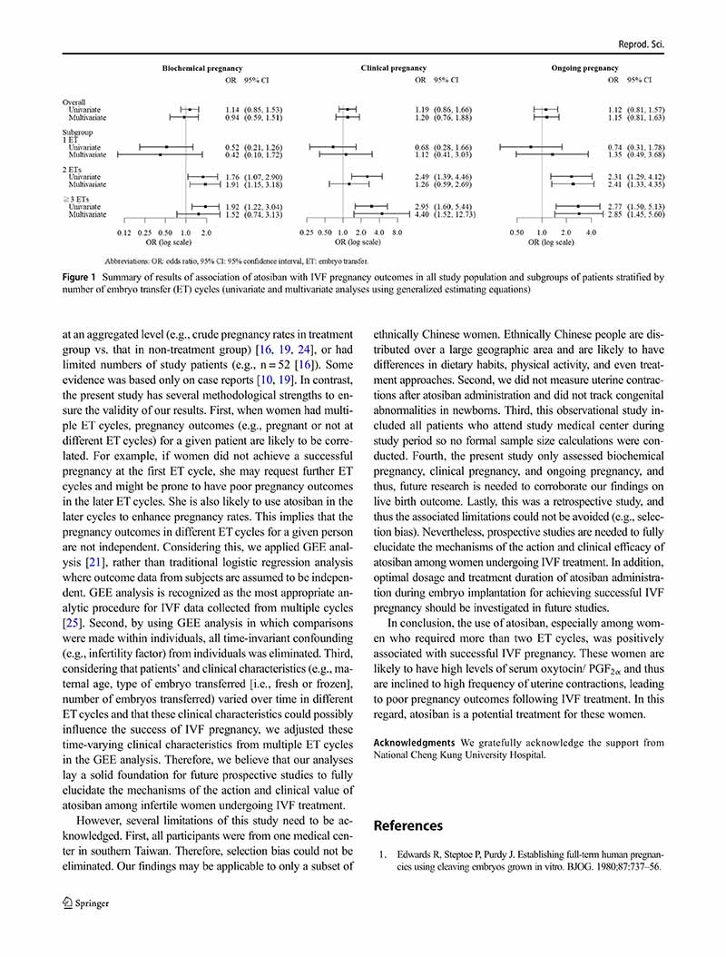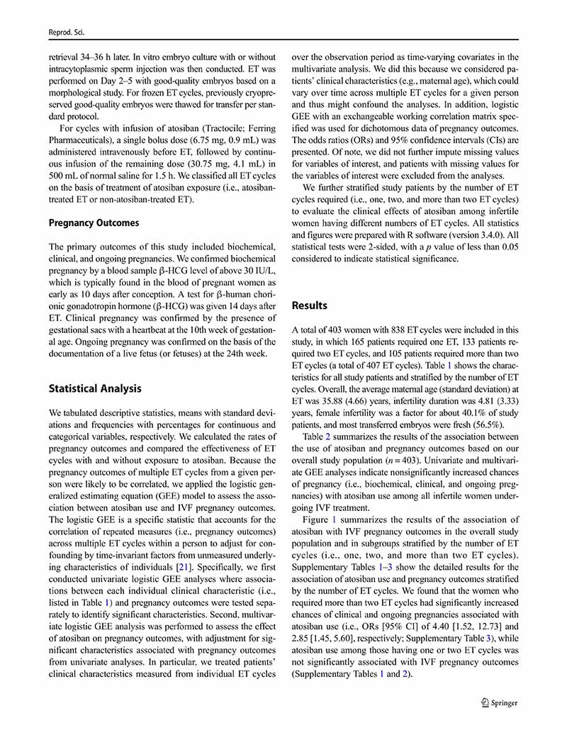 一項縱向隊列研究:阿托西班用于單個、兩個或多個胚胎移植周期的患者體外受精后的妊娠結局