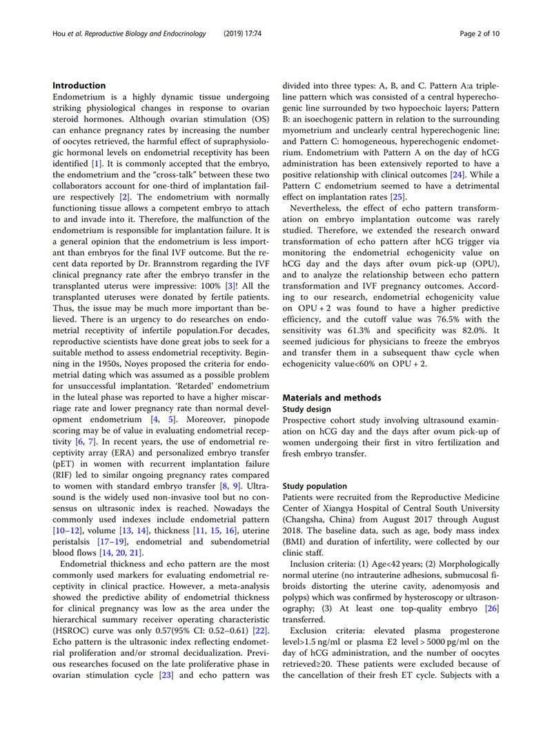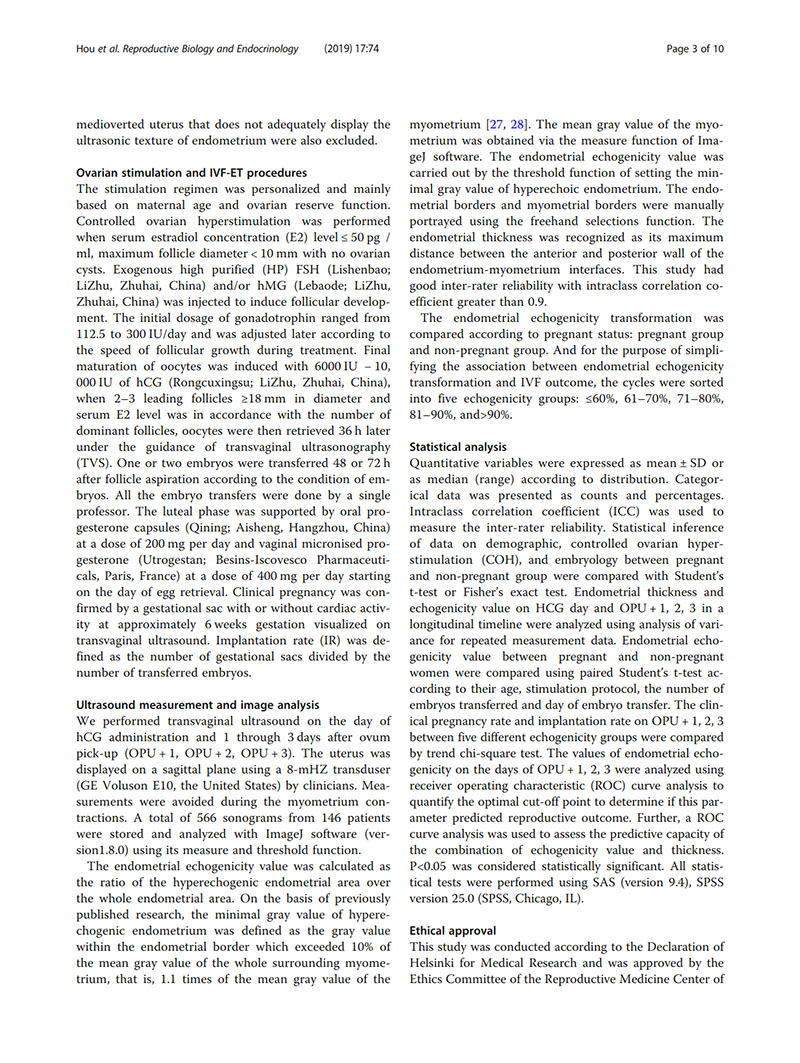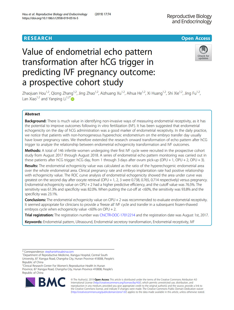背景:非侵入性測量子宮內(nèi)膜容受性的方法很有價值,因為它有可能改善體外受精(IVF)結局。有人認為hCG給藥當天的子宮內(nèi)膜回聲是子宮內(nèi)膜容受性的良好標志。在日常實踐中,我們注意到胚胎移植日子宮內(nèi)膜非均質(zhì)高回聲的患者通常妊娠率較低。因此,我們將延伸擴展了hCG觸發(fā)后子宮內(nèi)膜回聲模式轉(zhuǎn)化的研究,以分析子宮內(nèi)膜回聲改變與IVF結局之間的關系。