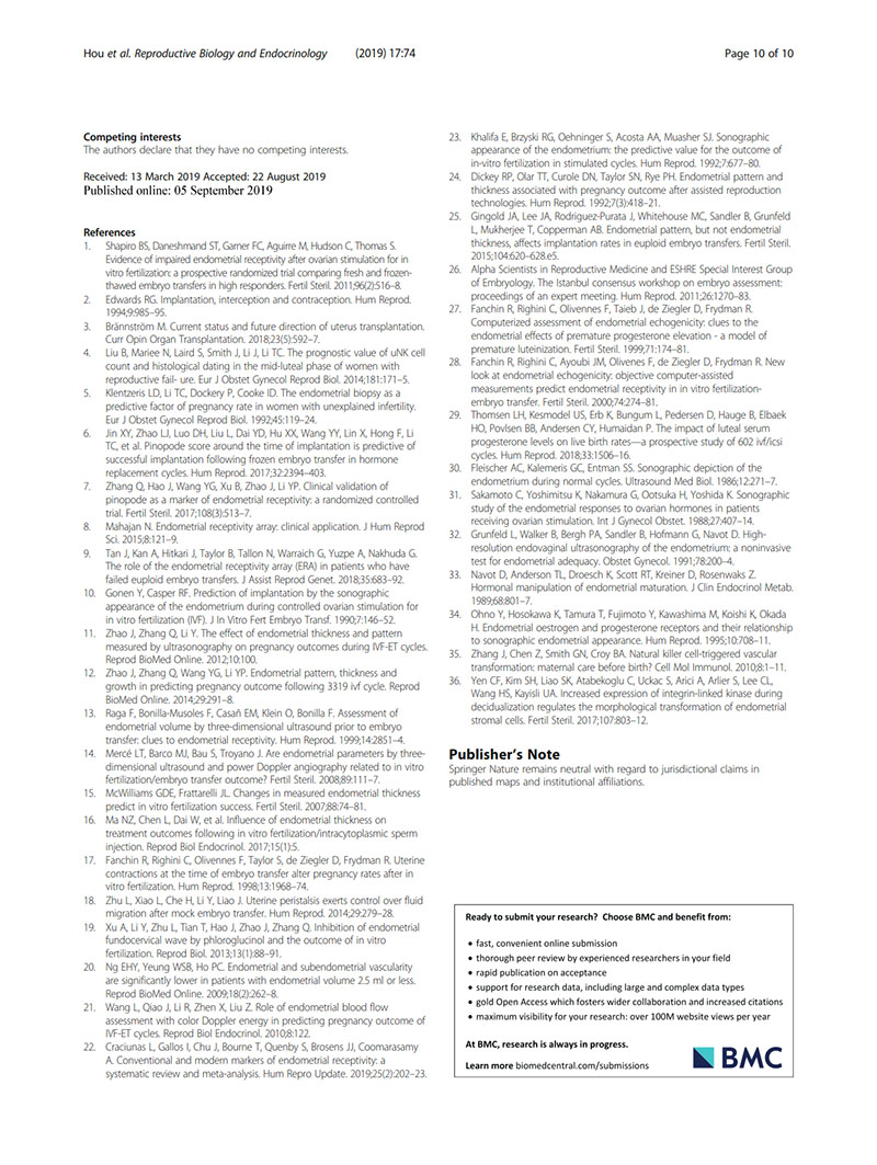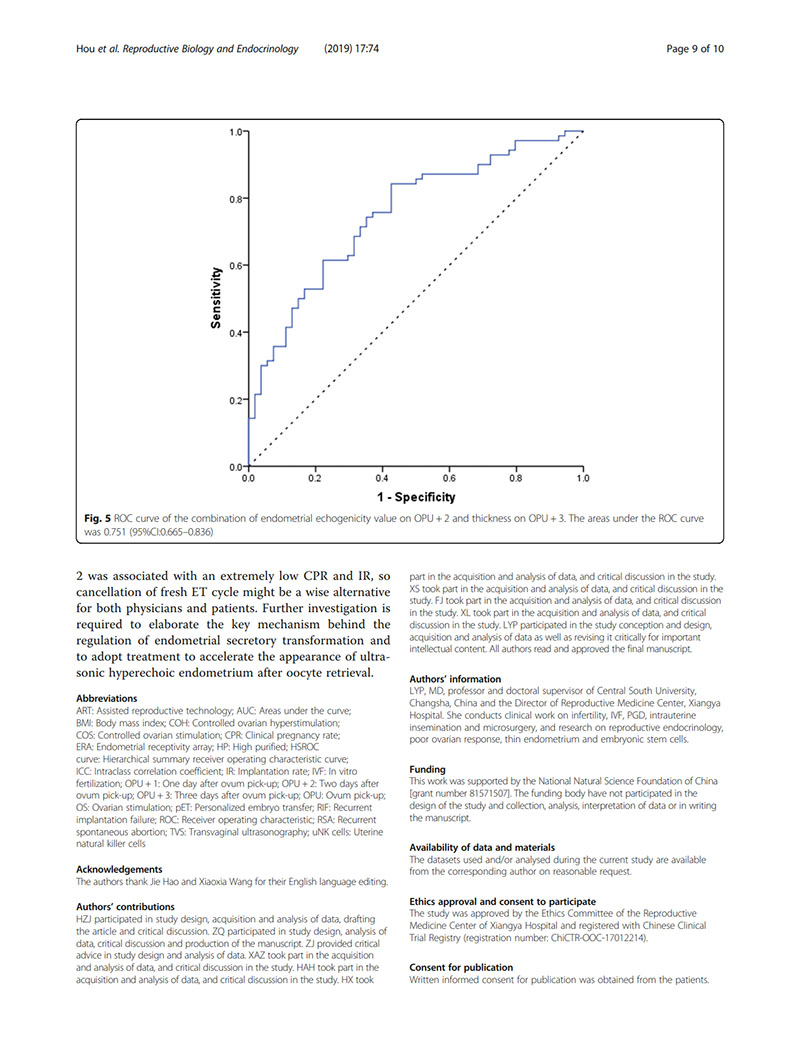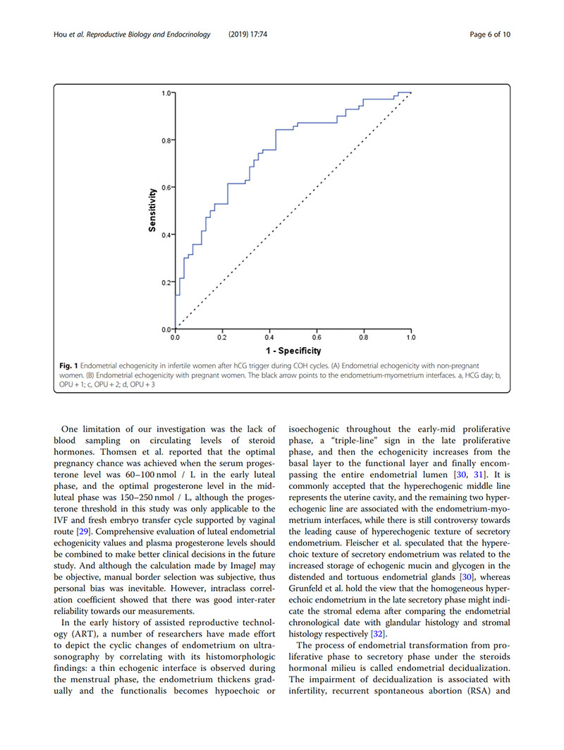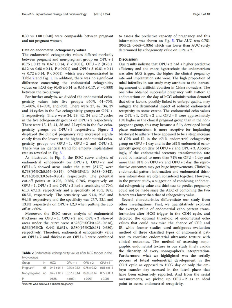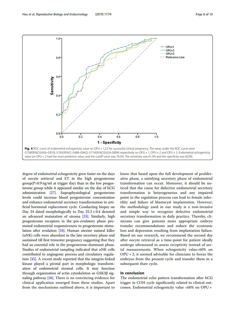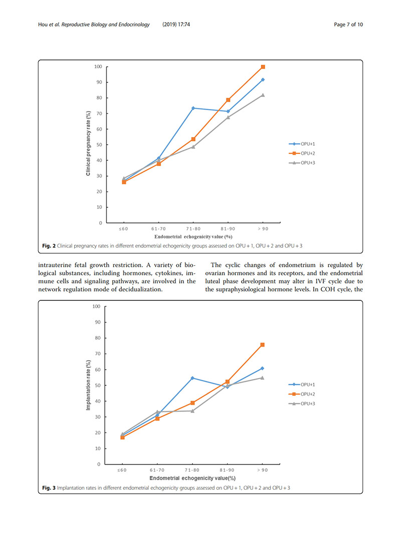 結論:建議用取卵后第2天(OPU+2)的子宮內(nèi)膜回聲值評價子宮內(nèi)膜容受性。當OPU+2的回聲值<60%時,臨床醫(yī)生似乎適合提供“全冷凍”IVF周期,并在隨后的凍融胚胎周期中進行移植。